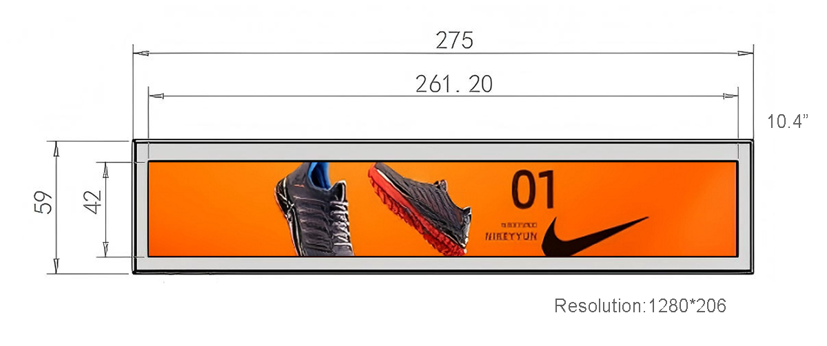 10.4 Inch Metal Narrow Stretched LCD Display Display area:261.2*42mm Resolution:1280*205 Material:Metal