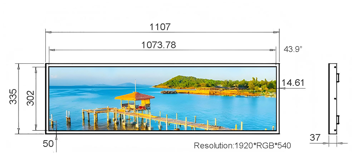 43.9 Inch Metal Stretched LCD Display Display area:1073.78*302mm Resolution:1920*540/3840*1080 Material:Metal