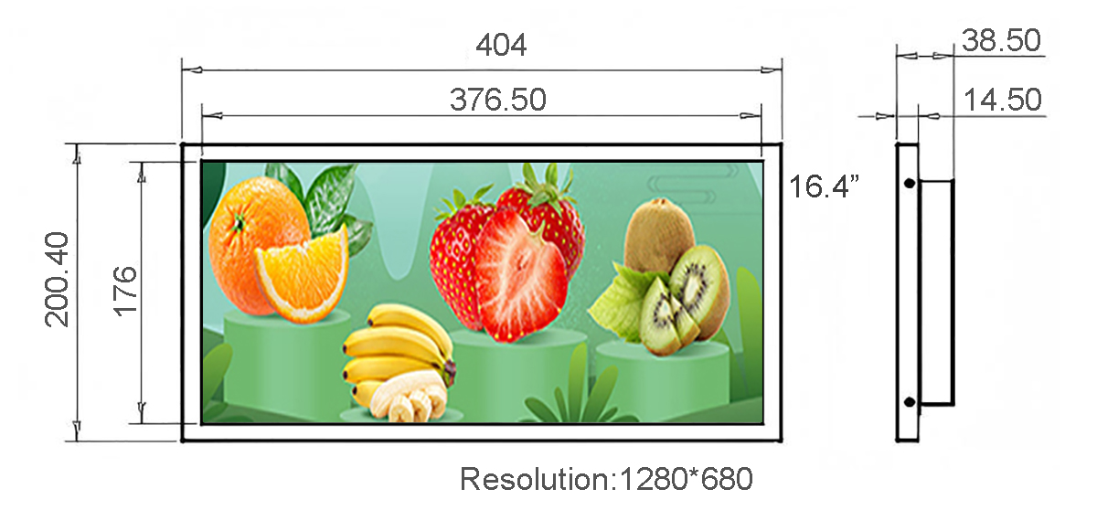 16.4 inch stretched bar lcd monitor Display area:1280*680 Resolution:376.5*176mm Material:Metal Touch style:G+GCapacitive Touch screen