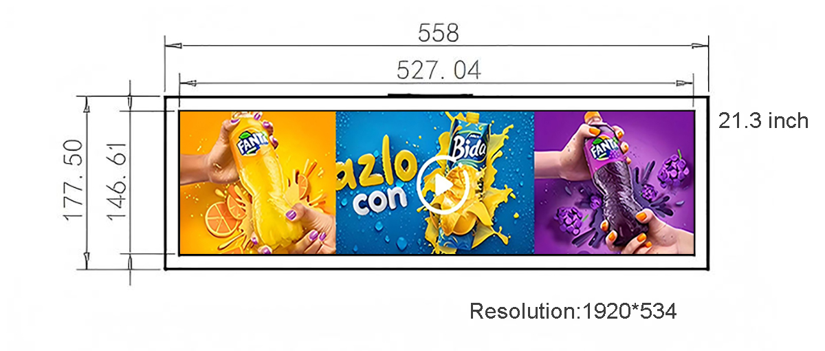 21.3 inch Metal stretched lcd display Resolution:1920*534 Display area:527*146.61mm Material:Metal