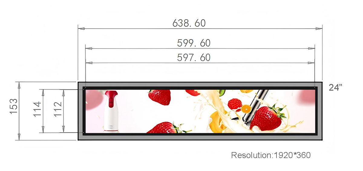 24 inch Metal Stretched Bar LCD Screen Display area:597.6*112mm Resolution:1920*360 Material:Metal Touch style:G+G Capacitive Touch screen