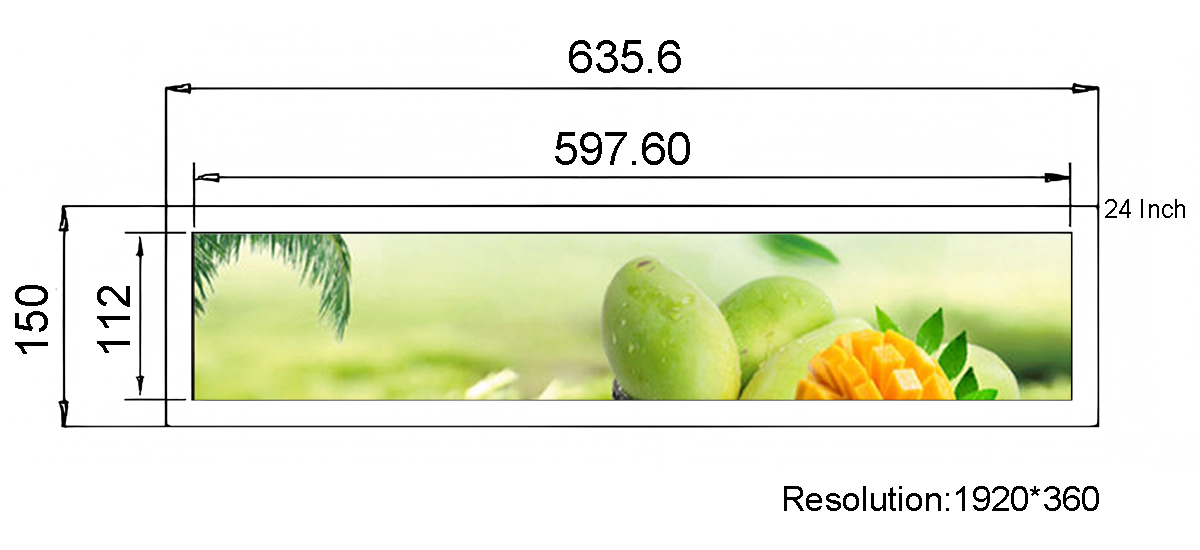 24 Inch Metal Stretched Bar LCD Screen Display area:597.6*112mm Resolution:1920*360 Touch style:G+G Capacitive Touch screen Material:Metal