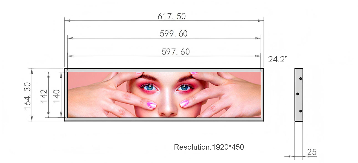 24.2 Inch Metal Stretched Bar LCD Monitor Display area:597.6*140mm Resolution:1920*450 Material: Metal