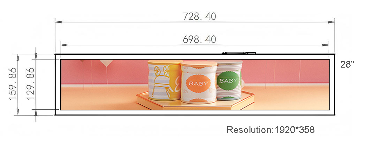 28 Inch Metal Stretched LCD Display Display area:698.4*129.86mm Resolution:1920*360 Material:Metal