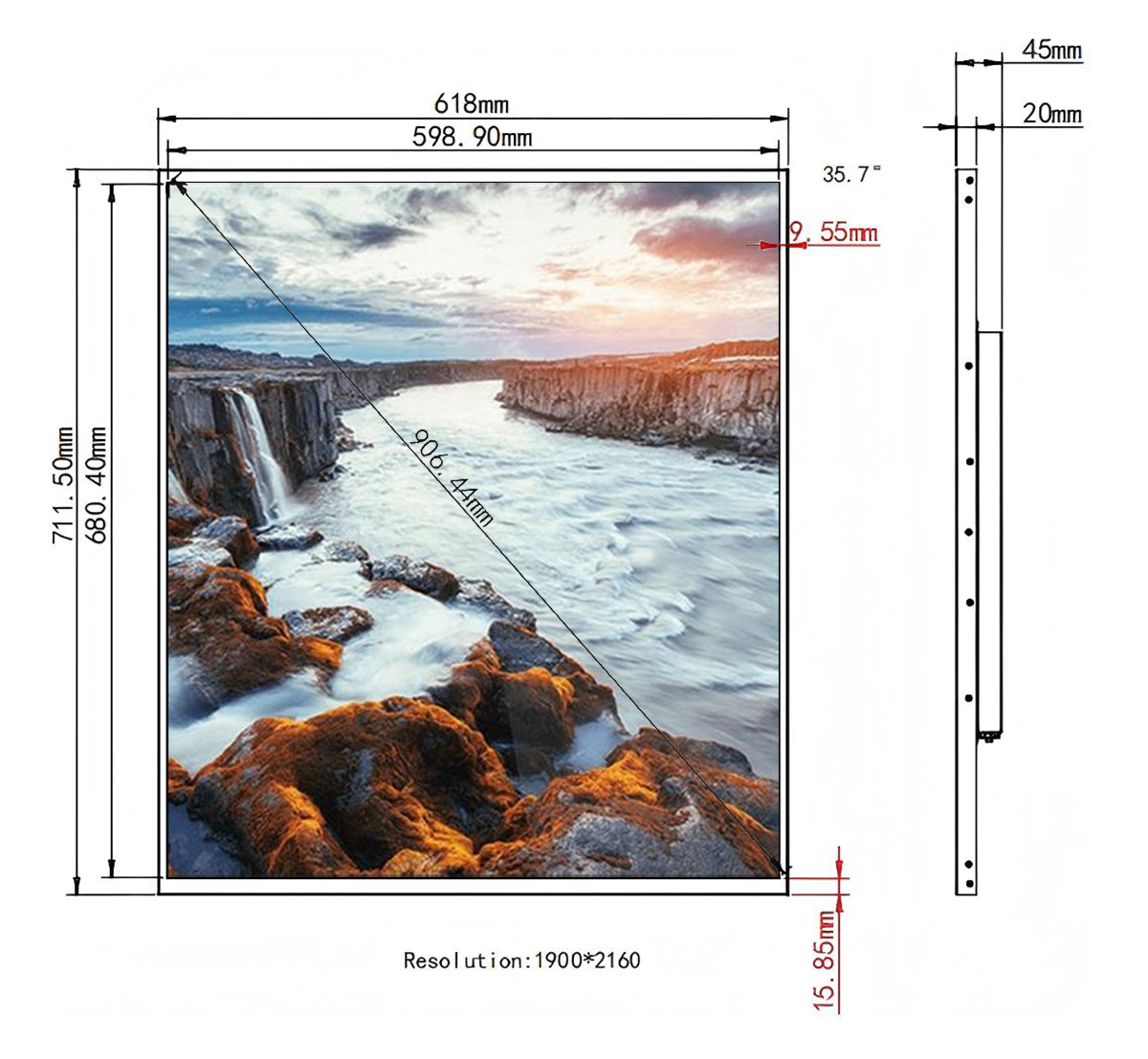 35.7 inch 4:3 Metal Square Display Resolution:1900*2160 Display area:598.9*680.4mm Material:Metal