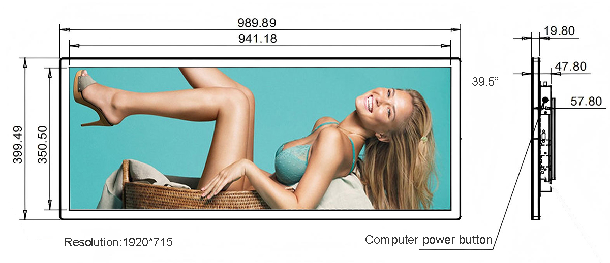 39.5 Inch Aluminum Stretched LCD Display Display area:940.9*350.5mm Resolution:1920*715/3840*1430 Material:Aluminum