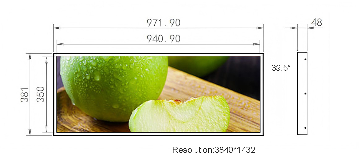 39.5 Inch Metal Stretched LCD Display Display area:940.5*350mm Resolution:1920*540/3840*1080 Material:Metal