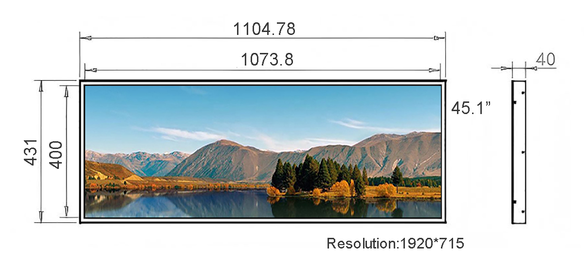 45.1 Inch Metal Stretched LCD Display Display area:1073.78*400mm Resolution:1920*751/3840*1502 Material:Metal