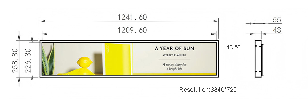 48.5 Inch Metal Stretched LCD Display Display area:1209.6*226.8mm Resolution:1920*360/3840*720 The material of shell:Metal