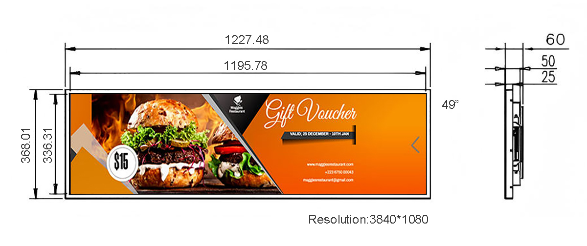49 Inch Metal Stretched LCD Display Display area:1195.7*336.3mm Resolution:3840*1080 Material:Metal