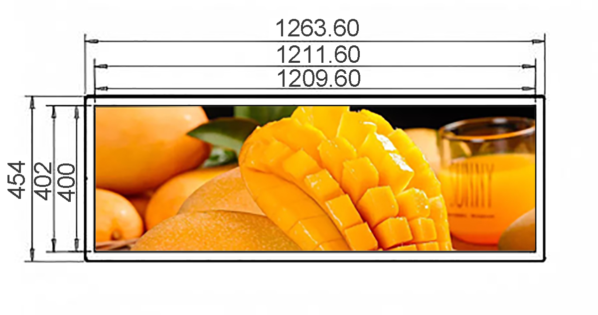 50.2 Inch Aluminum Stretched LCD Display Display area:1209.6*400mm Resolution:1920*636/3840*1270 Material:Aluminum、Tempered