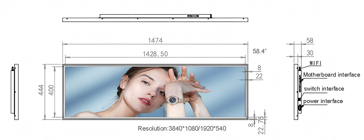 58.4 Inch Metal Stretched LCD Display Display area:1635.84*633.89mm Resolution:3840*1488 Material:Metal、Tempered glass