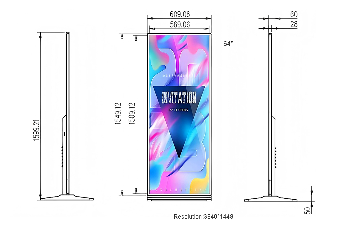 64 Inch Vertical Full-Screen Advertising Display Display area:1509.12*569.06mm Resolution:3840*1448 Material:Aluminum、Tempered glass、Caster base Touch style:G+FF Capacitive Touch screen