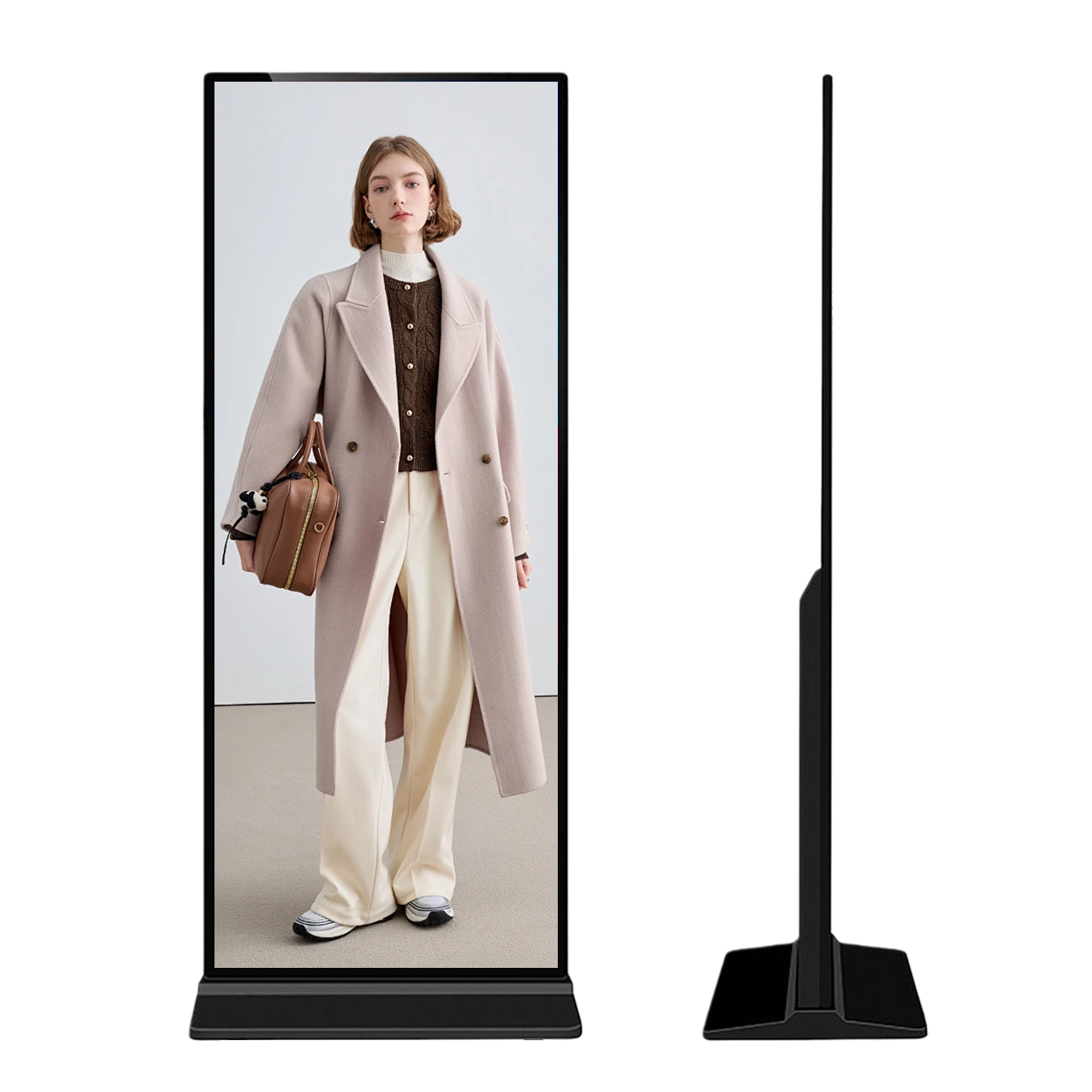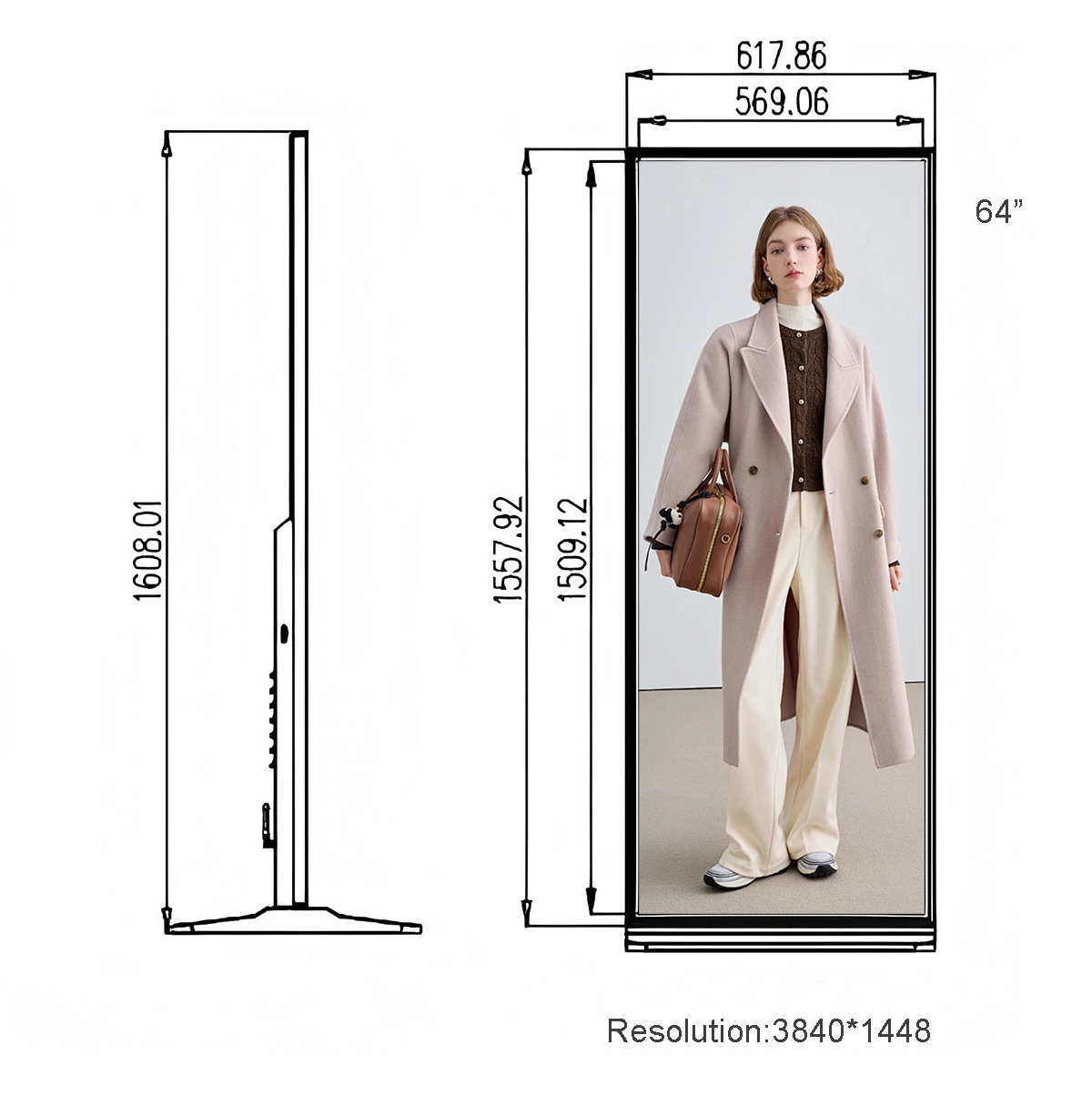 64 Inch Vertical Full-Screen Advertising Display Display area:1509.12*569.06mm Resolution:3840*1448 Material:Aluminum、Tempered glass、Caster base Touch style:Multi-point infrared touch screen