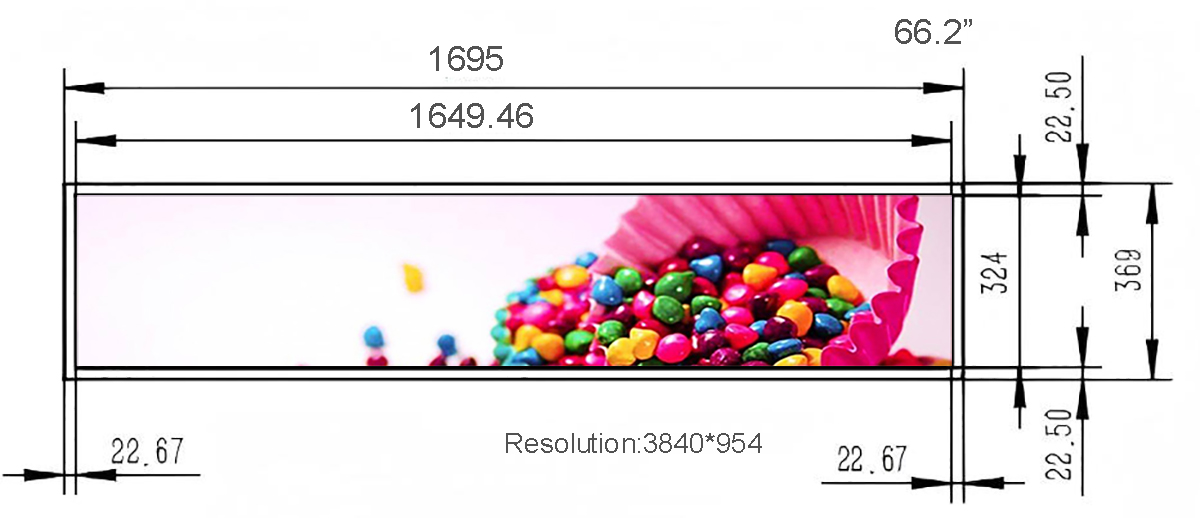 66.2 Inch Metal Stretched LCD Display Display area:1649.66*324mm Resolution:3840*954 Material:Metal Touch style:Infrared TouchScreen
