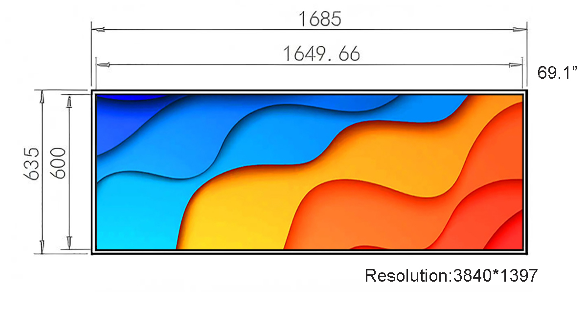 69.1 Inch Metal Stretched LCD Display Display area:1649.66*600mm Resolution:3840*1397 Material:Metal、Tempered glass