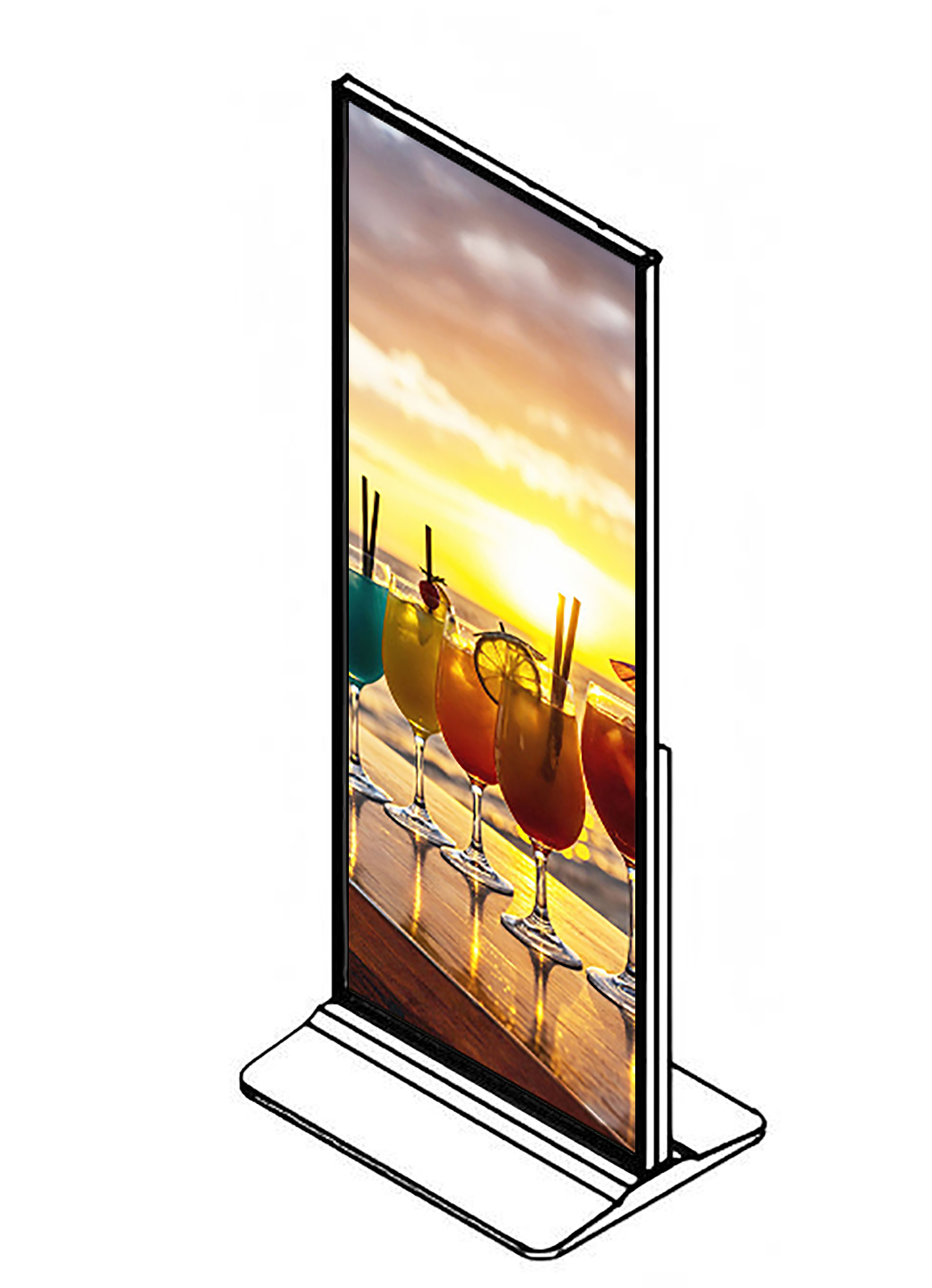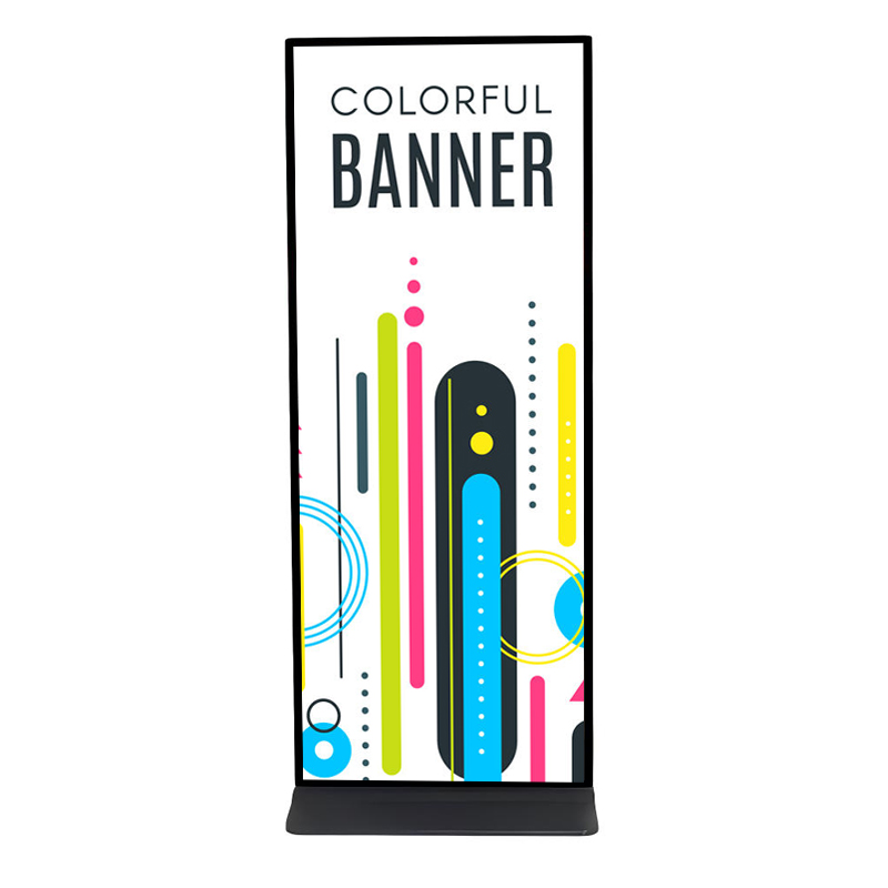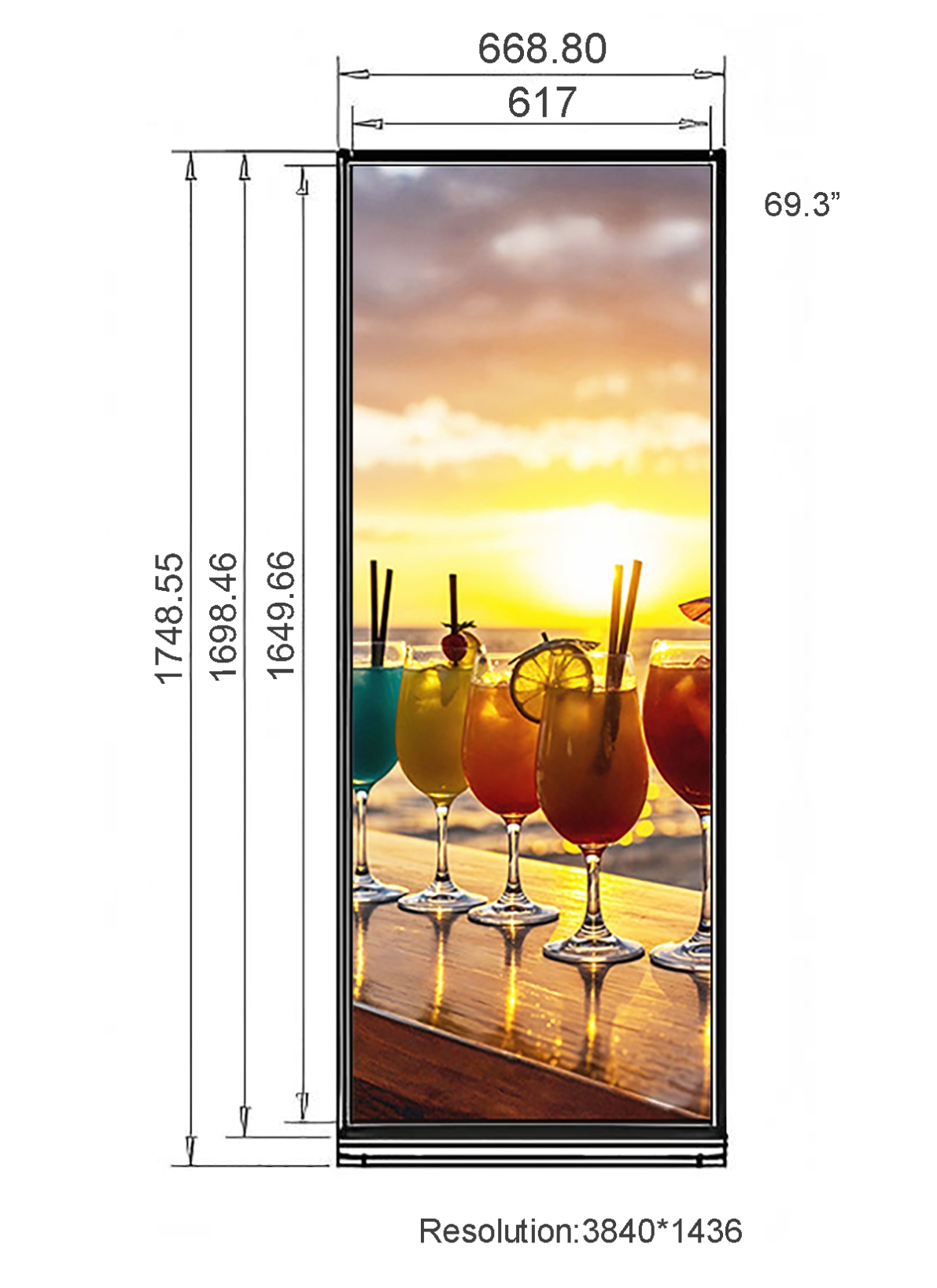 69.3 Inch Vertical Full-Screen Advertising Display Display area:1649.66*617mm Resolution:3840*1436 Material:Aluminum、Tempered glass、Caster base Touch style:Multi-point infrared touch screen