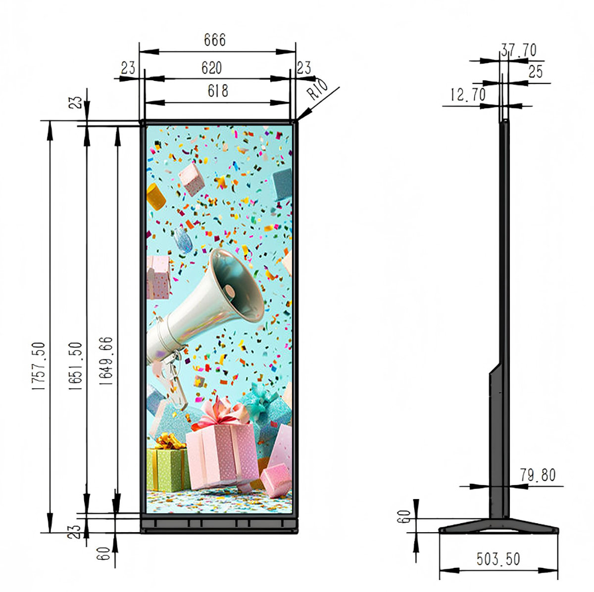 75 Inch Aluminum Portable Digital Signage Display area:1649.66*618mm Resolution:3840*1440 Material:Aluminum
