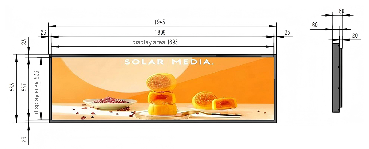 77.5 Inch Aluminum Stretched LCD Display Display area:1895*533mm Resolution:3840*1080 Material:Aluminum、Tempered glass Touch style:Multi-point Infrared TouchScreen