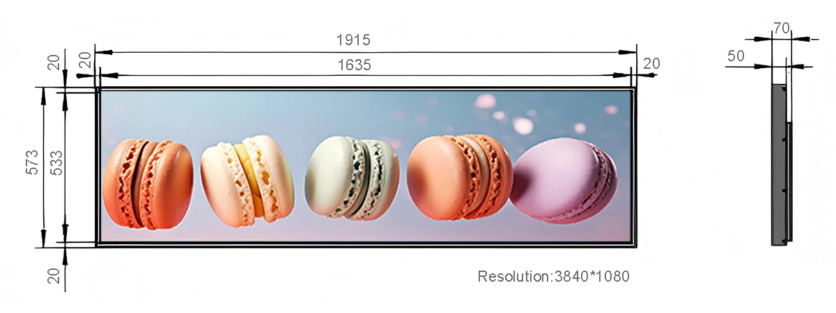 77.5 Inch Hardware Stretched LCD Display Display area:1895*533mm Resolution:3840*1080 Material:Hardware、Tempered glass