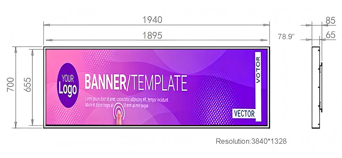 78.9 Inch Metal Stretched LCD Display Display area:1895*655mm Resolution:3840*1328 Material:Metal、Tempered glass Touch style:Multi-point infrared touch screen