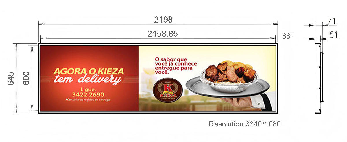 88 Inch Metal Stretched LCD Display Display area:2158.85*600mm Resolution:3840*1080 Material:Metal、Tempered glass Touch style:G+FF Capacitive Touch screen/Multi-point infrared touch screen