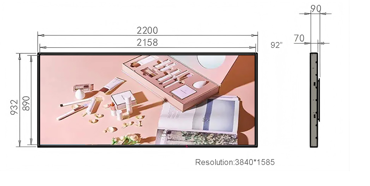 92 Inch Metal Stretched LCD Display Display area:2158.85*890mm Resolution:3840*1585 Material:Metal Touch style:Multi-point infrared touch screen