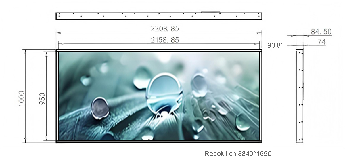 93.8 Inch Metal Stretched LCD Display Display area:2158.85*950mm Resolution:3840*1690 Material:Metal、Tempered glass Touch style:Multi-point infrared touch screen