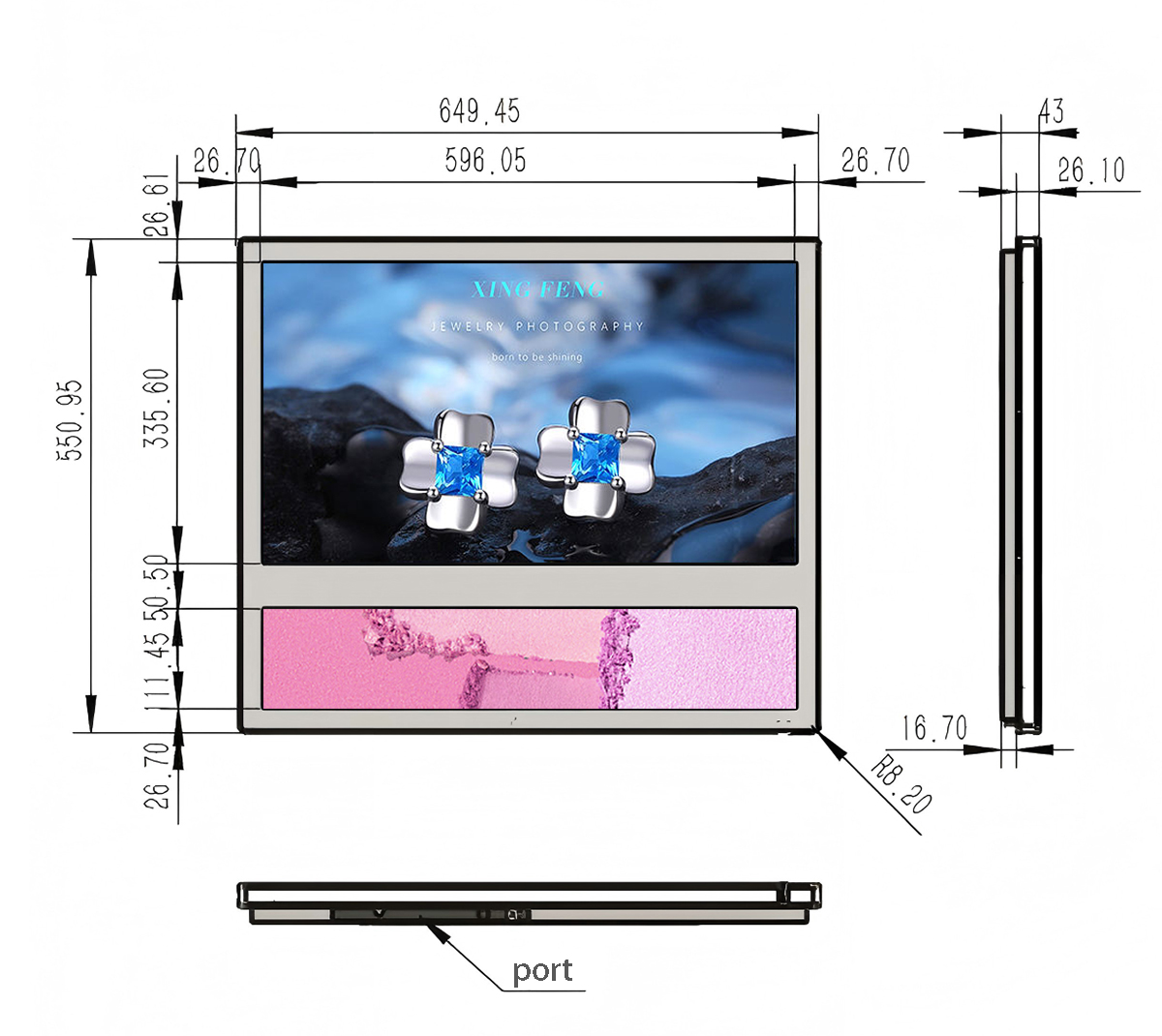 27+24 Inch Dual screen Stretched LCD Display Display area:596*335+ 596*111.5mm Resolution:1920*1080+1920*360 Material:Aluminum