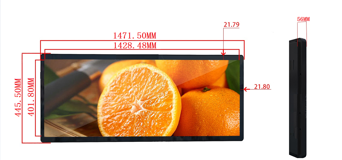 58.4 Inch Aluminum Stretched LCD Display Display area:1428.487*401.80mm Resolution:1920*540/3840*1080 Material:Aluminum