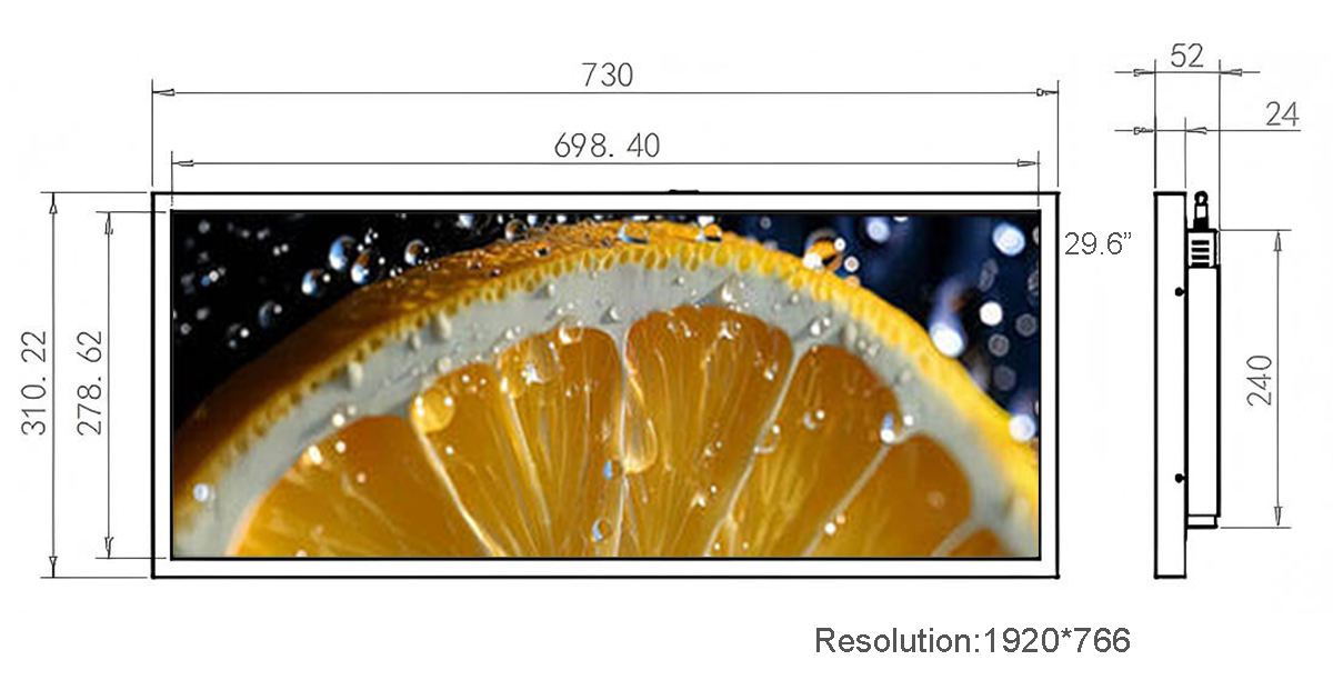 29.6 Inch Stretched LCD Display Display area:698.4*278.62mm Resolution:1920*766 Material:Metal
