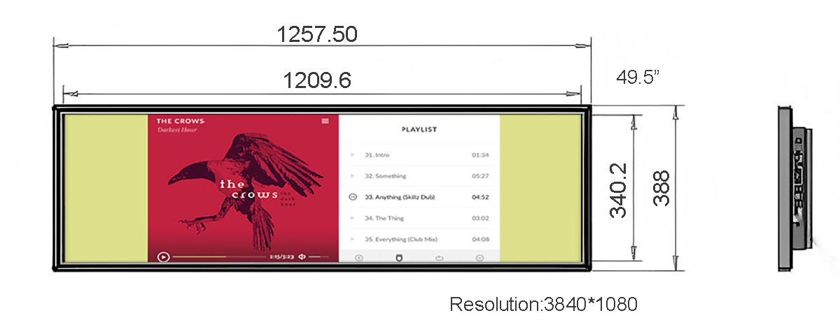 49.5 Inch Aluminum Stretched LCD Display Display area:1209.6*340.2mm Resolution:1920*540/3840*1080 Material:Aluminum Touch style:Multi-point infrared touch screen